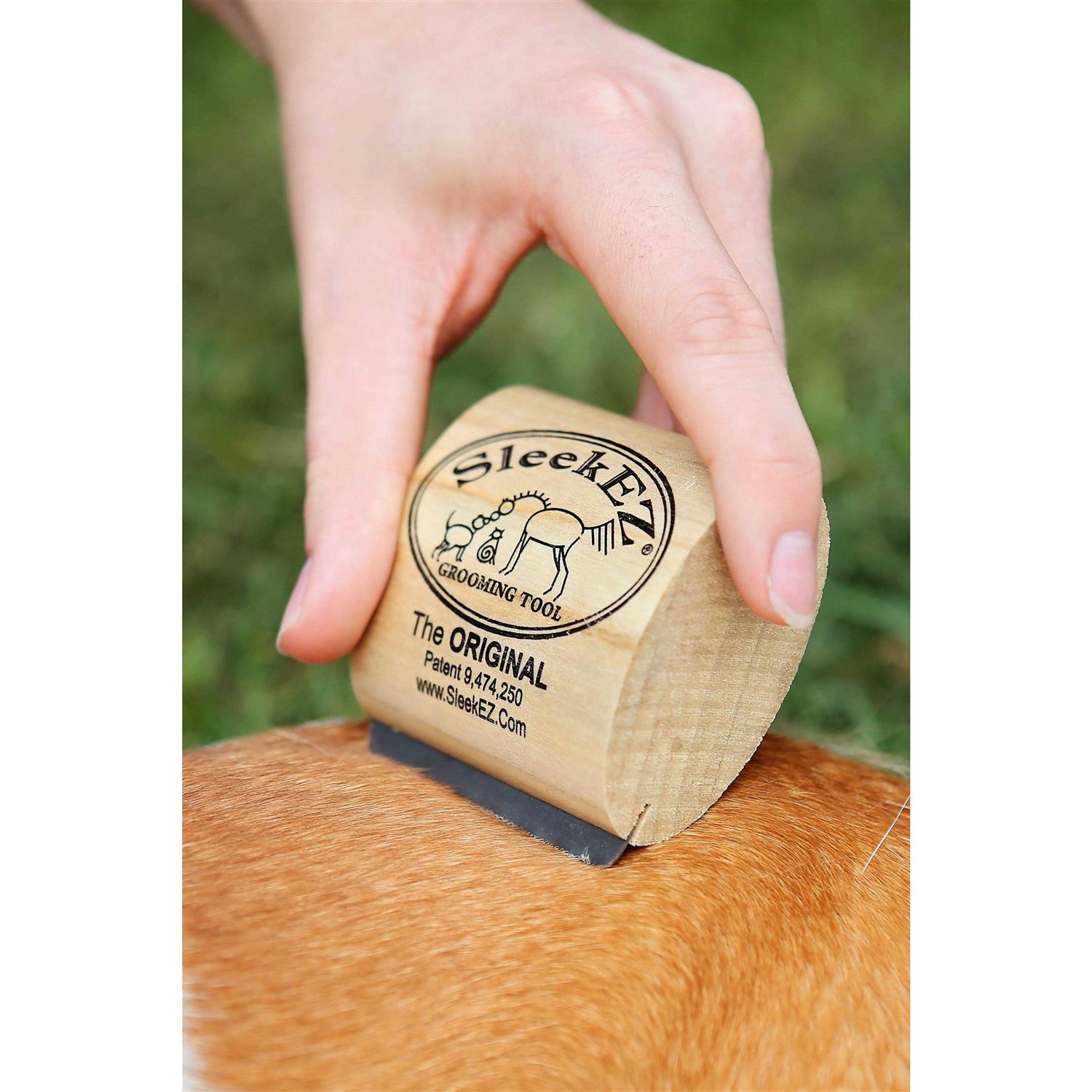 As a keen observer of animal behavior, and a former equine dentist who paid a lot of attention to the poll area (where the head meets the neck) of horses through her work, SleekEZ creator Jennifer Tipton noted that animals scratch and lick themselves through motion of the poll. And, animals do seem to like how it feels. After all, horses, dogs and cats often affectionately groom one another. For this reason Jen designed a grooming tool with and oval handle that rolls in your palm(s) This natural motion over the animal’s body is soothing and affectionate. Our tools have no sharp teeth or prickly tines irritating the skin. SleekEZ’s grooming tools have a unique tooth configuration of teeny, tiny teeth that do not contact the skin in most situations but when so it provides a pleasing scratch. Because of the ideal tooth pattern and configuration, these patented grooming tools work on a variety of coats; fine to thick and long to short (though more ideal on medium- and short-coated dogs) to quickly remove all shedding hair plus dirt and dander. There truly isn’t any other grooming tool on the market that makes any shaggy coat sleek within minutes with this much ease, comfort and affordability.