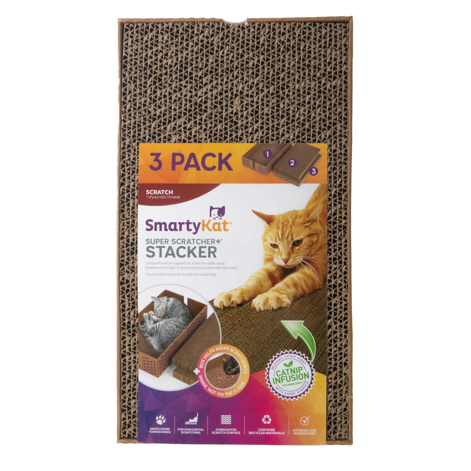 SmartyKat Super Scratcher+ Stacker Catnip-Infused Corrugate Floor Cat Scratch Pad comes with three reversible durable corrugated cardboard scratch pads in a high-walled tray. When one side of the corrugate scratch pad is worn, flip it over for a new scratching surface. Move on to the next scratch pad when both sides are worn to have a brand-new scratcher. You can stack the scratch pads for a cat scratch and lounge area. Or use one or two at a time for a high-walled cat scratcher and cat bed. A process that infuses highly concentrated catnip between each layer of cardboard, releasing a potent catnip scent every time your cat scratches. Redirecting cats from scratching your furniture with less mess and less work than loose catnip.