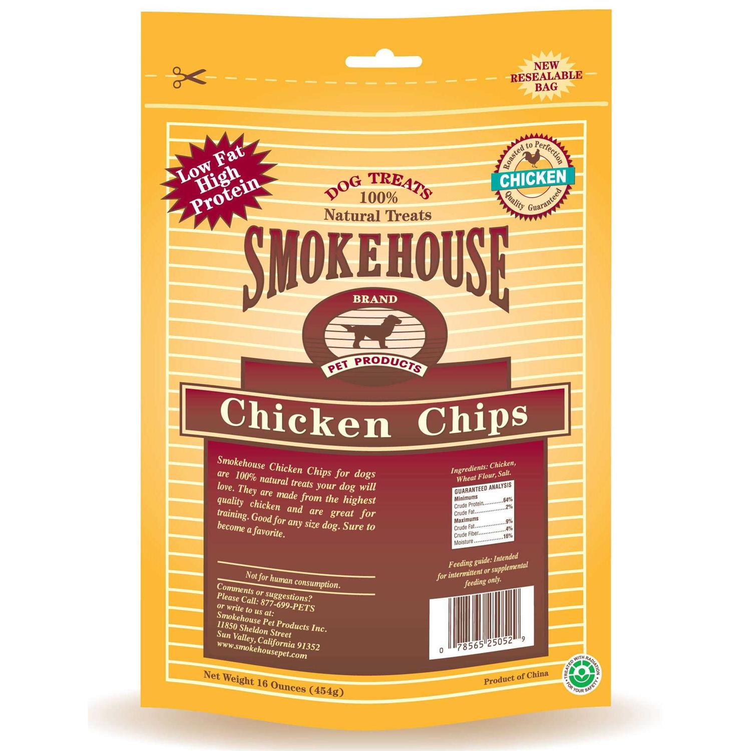 Smokehouse Small Chicken Chips Dog Treats, 16-oz bag; Smokehouse Chicken Chips are all-natural treats that your dog can really enjoy! Smokehouse uses only the finest-quality chicken, roasted to create a true chicken taste dogs love. They make a great treat as well as a wonderful training aid.