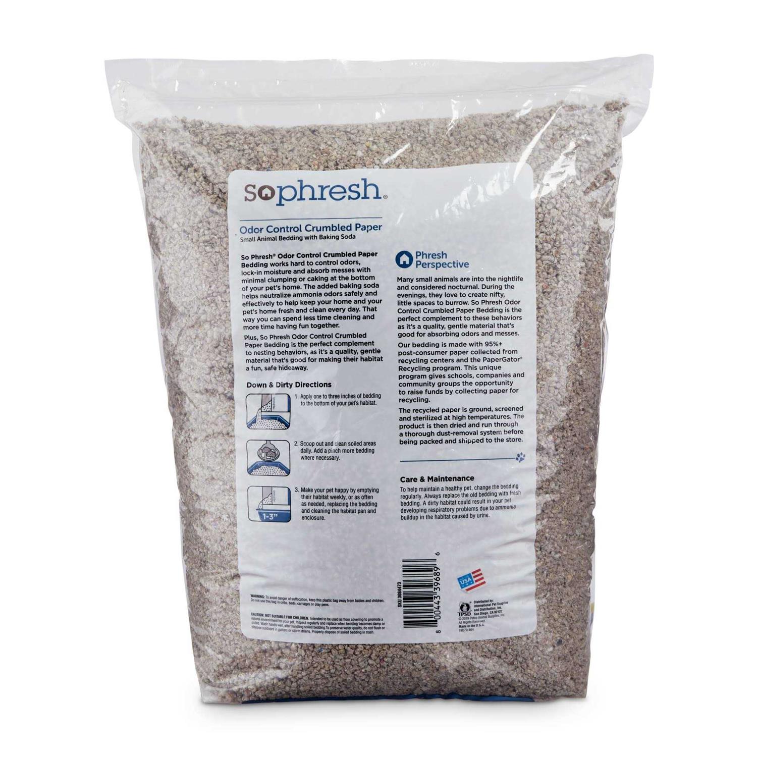 Bedding & Litter by So Phresh. Details:The So Phresh Crumbled Paper Small Animal Bedding works hard to absorb messes with minimal clumping or caking at the bottom of your pet’s home. Add this bedding to your pet’s home to effectively hit refresh on their habitat as they burrow to their heart’s delight.