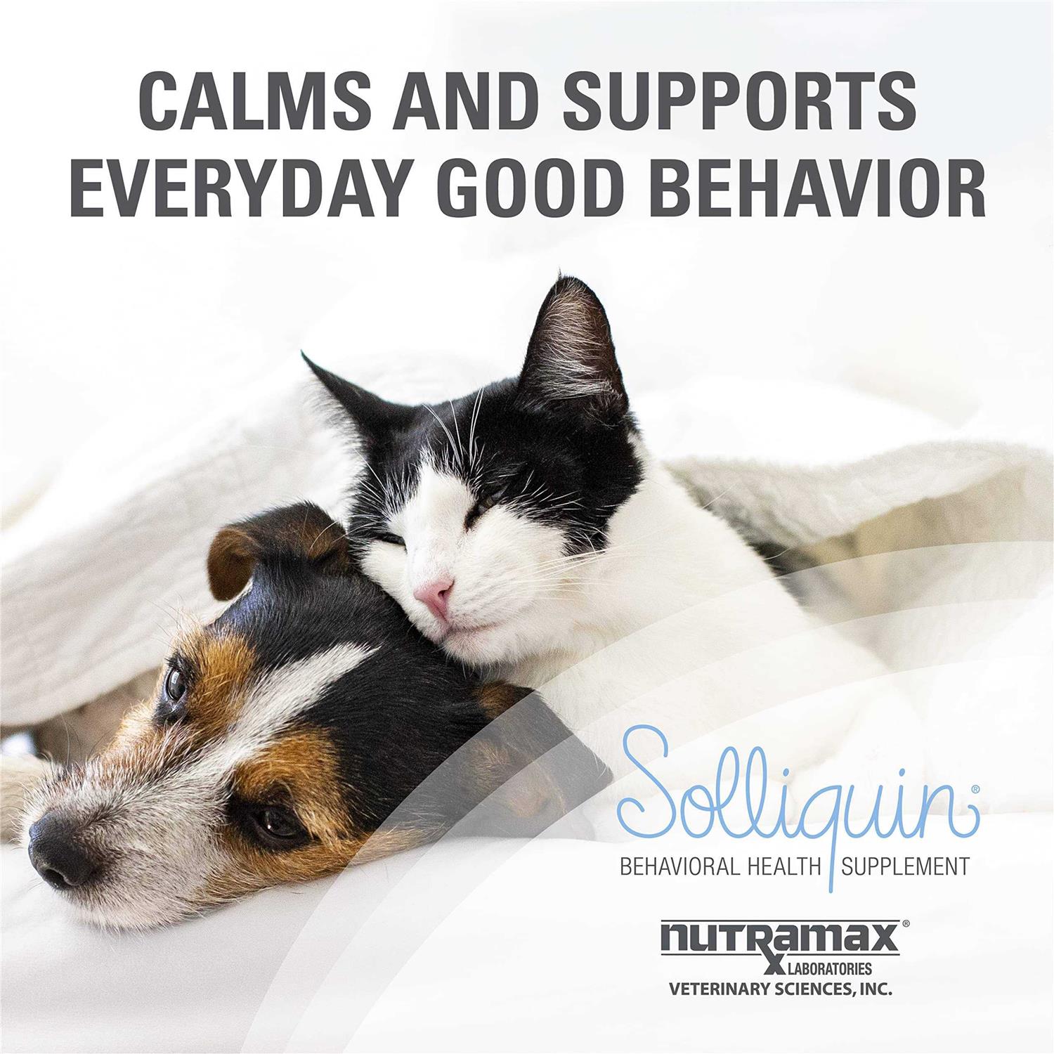 Solliquin Behavioral Health Supplement for dogs and cats helps support balanced behavior and relaxation and, for best results, may be used with behavioral training. Solliquin is intended for daily use, however the recommended daily amount may be repeated prior to an expected stressful event. Solliquin Behavioral Health Supplement is brought to you by Nutramax Laboratories Veterinary Sciences, the #1 veterinarian recommended supplement company. *Source: Survey conducted among small animal veterinarians who recommended animal supplements.