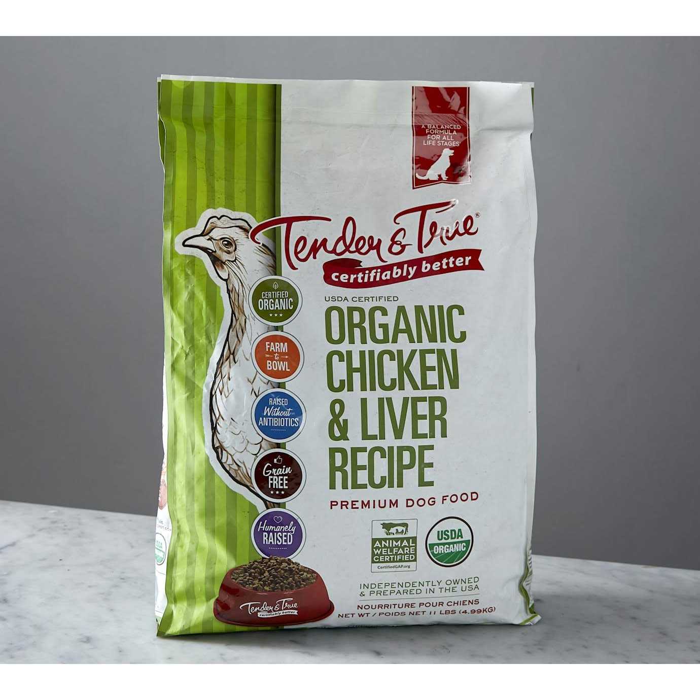 This farm-to-table kibble features certified organic, humanely raised chicken as the first ingredient. The grain-free recipe contains no wheat, corn, soy or artificial colors, flavors or preservatives. Tender & True Pet Nutrition believes in crafting only the very best recipes for your best friend! Prepared in the USA. Organic, humanely raised chicken is the first ingredient in this dry dog food recipe. Certified organic by the USDA and certified humanely raised by Global Animal Partnership. Grain-free formula contains no artificial preservatives, colors or flavors. Offers 100% complete and balanced nutrition for dogs of all life stages.