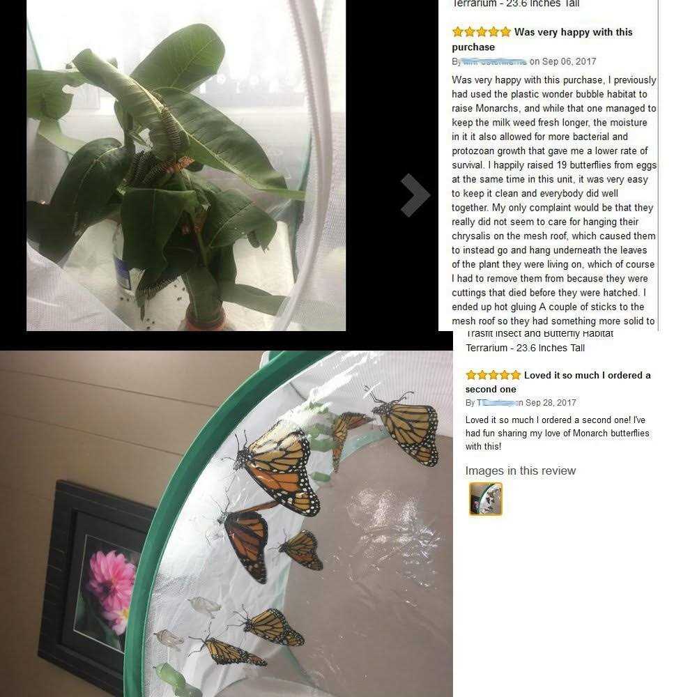 Trasfit Collapsible design butterfly habitat(15.7*15.7*23.6inches). Five mesh panels for good airflow. Collapsible design for easy storage, When unfolded the unit measures 15.7-in x 15.7-in x 23.6-inch Large zipper opening for easy access to the terrarium Clear vinyl window panel for easy viewing. Compact collapsible design folds almost flat, will fit into backpack and is ideal for field work.