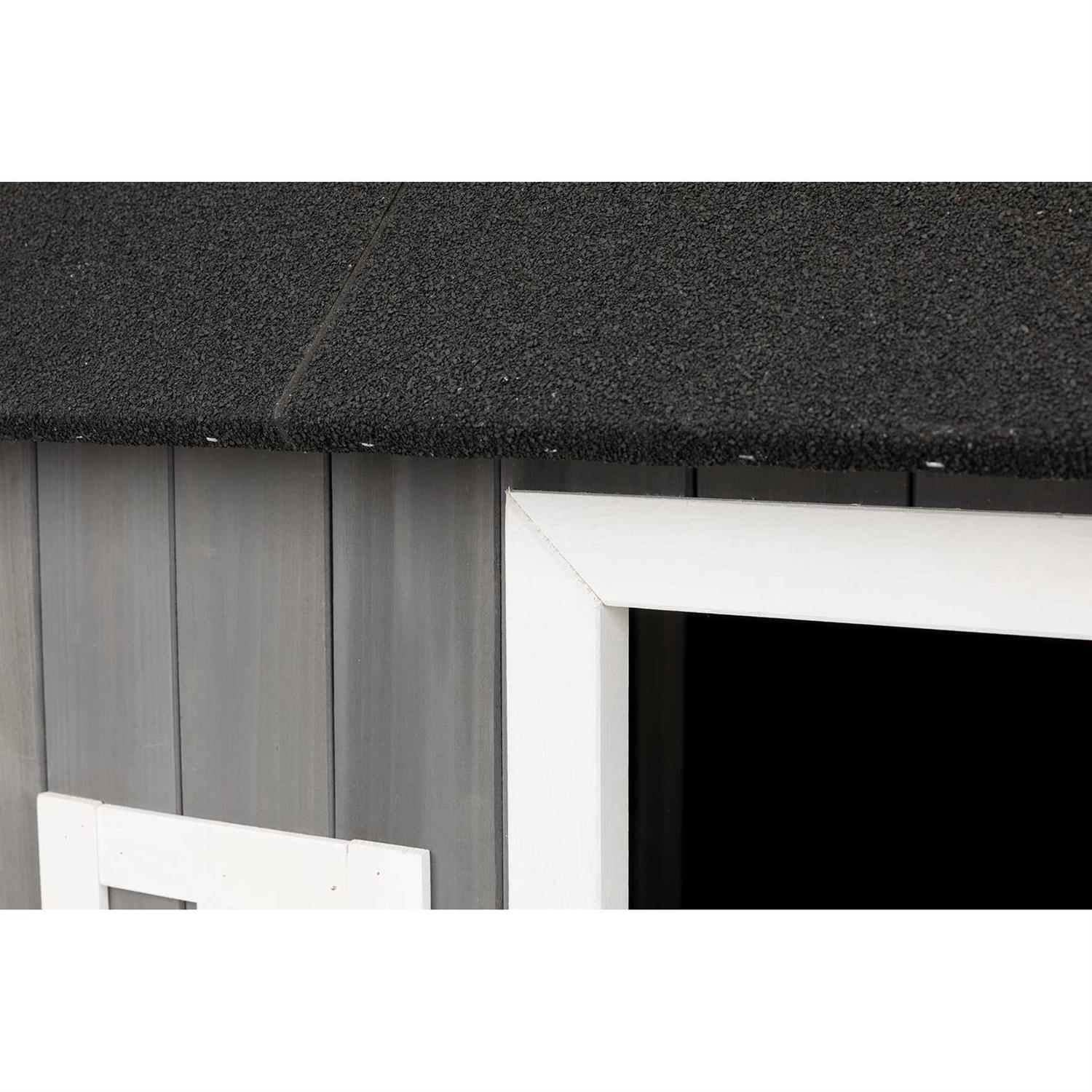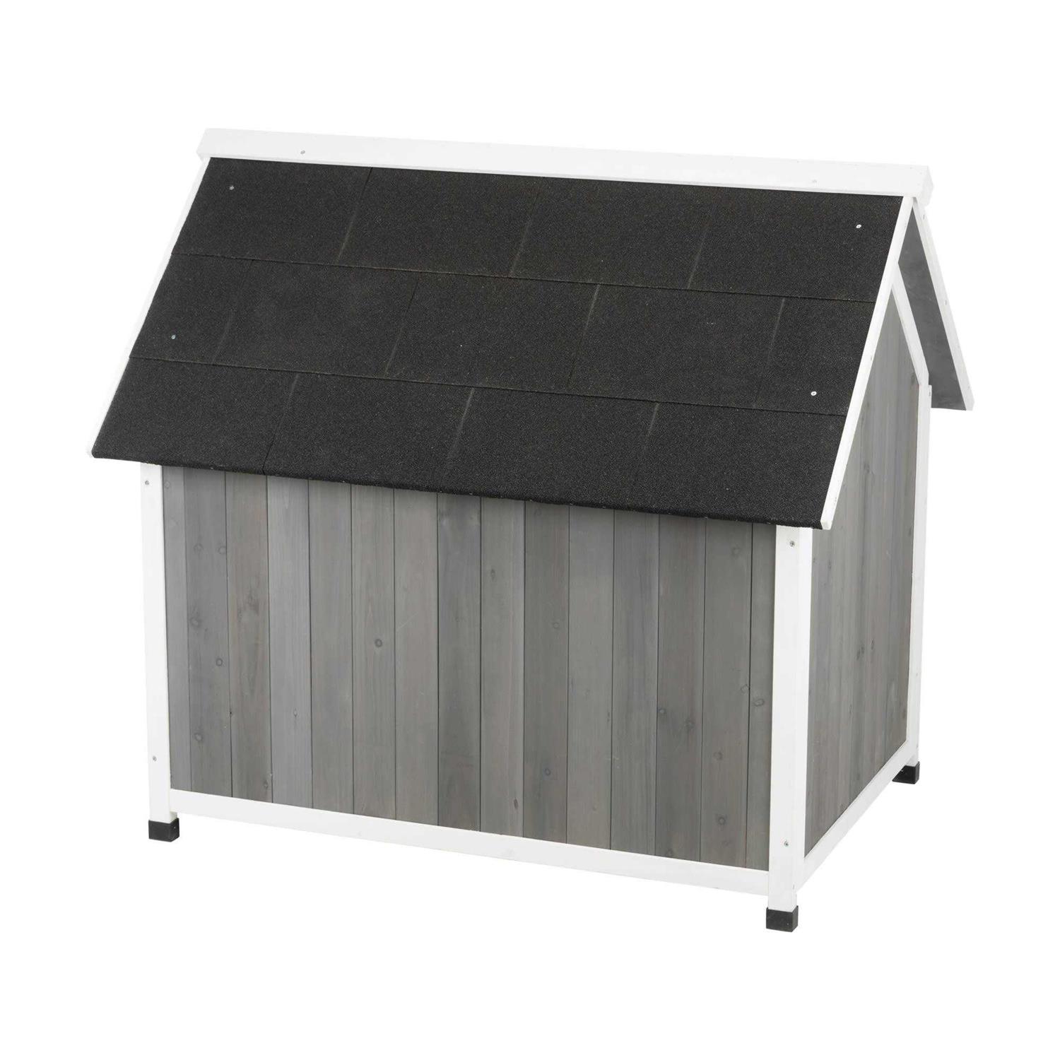 Being in the dog house is a good thing when it comes to the TRIXIE natura Barn Style Dog House. This wooden dog shelter braves the elements while remaining stylish with weatherproof solid fir construction. The raised floor and tongue-and-groove exterior protect your furry friend from chilling wind drafts. The gable style roof allows water to drain and is covered with a heavy-duty mineral roofing felt for greater protection against mother nature. Integrally designed legs lift the strong floor off the ground to prevent rising dampness and ensure adequate air circulation. This will help keep the floor cool in the summer and warm/dry in the winter. The plastic covered feet are adjustable to allow leveling the house on uneven ground. Complete with mock-barn windows this barn-style dog house is perfect for your country inspired living.