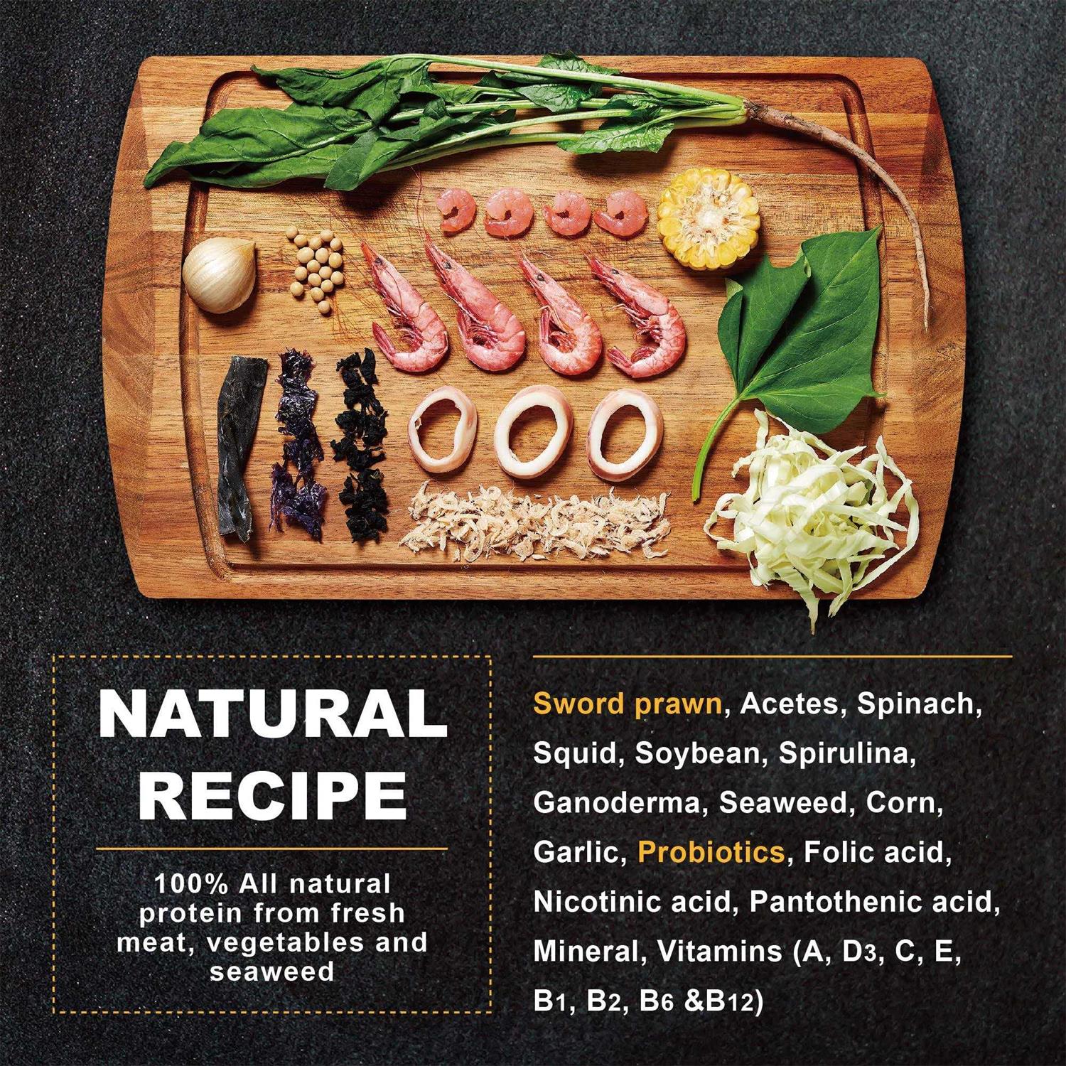 If you think about it, it’s easy to find nutritious food for cats or dogs. Doing the same for fish feed, however, is another story. Most fish feeds available on the market always contain some sort of chemical additives. This is where Ultra Fresh stands out. Made from 100% natural and carefully selected ingredients, our pet food contains Taiwan’s wild sword shrimp for up to 25-60%. In fact, it’s so good that no fish can resist it—even the pickiest ones! Our ultimate goal is to give pets a healthier choice from nature to keep them by your side for longer.