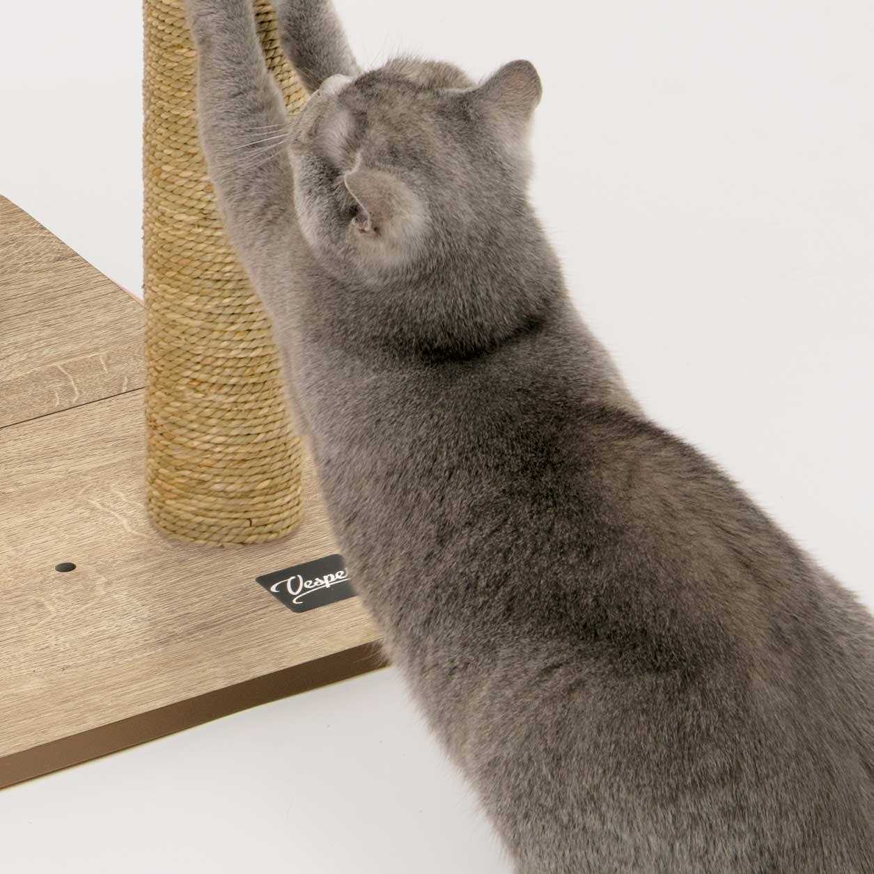 Vesper High Base – Oak Tall furniture for cats that love to sit up high Extra-long seagrass scratching post Tall observation platform High-quality MDF with oak-look laminate finish Cozy cubed den with two entrances Memory-foam cushions Easy to clean Replaceable parts available Also available in walnut The Vesper High Base is an excellent observation deck for cats that love to sit up high. The tall and slim scratching poles encourage extensive scratching in an elongated posture while the cubed den provides a cozy space for a nap. Cozy cubed den with two entrances The cozy cubed den is perfect for lounging and napping. The den has two entrances so your cat won’t feel cornered. Memory foam cushions The memory foam inside the soft cushions molds exactly to the body shape of your cat, providing your beloved feline with extra comfort. Easy to clean, with individual replacement parts The cushions and scratching mats can easily be removed for cleaning. Both the cushions and the mats are hand-washable. Replacement parts are available in case any part of your scratcher gets worn out. Extra-long seagrass scratching post The tall and slim scratching poles encourage extensive scratching in an elongated posture. They are made out of sturdy natural-colored seagrass.
