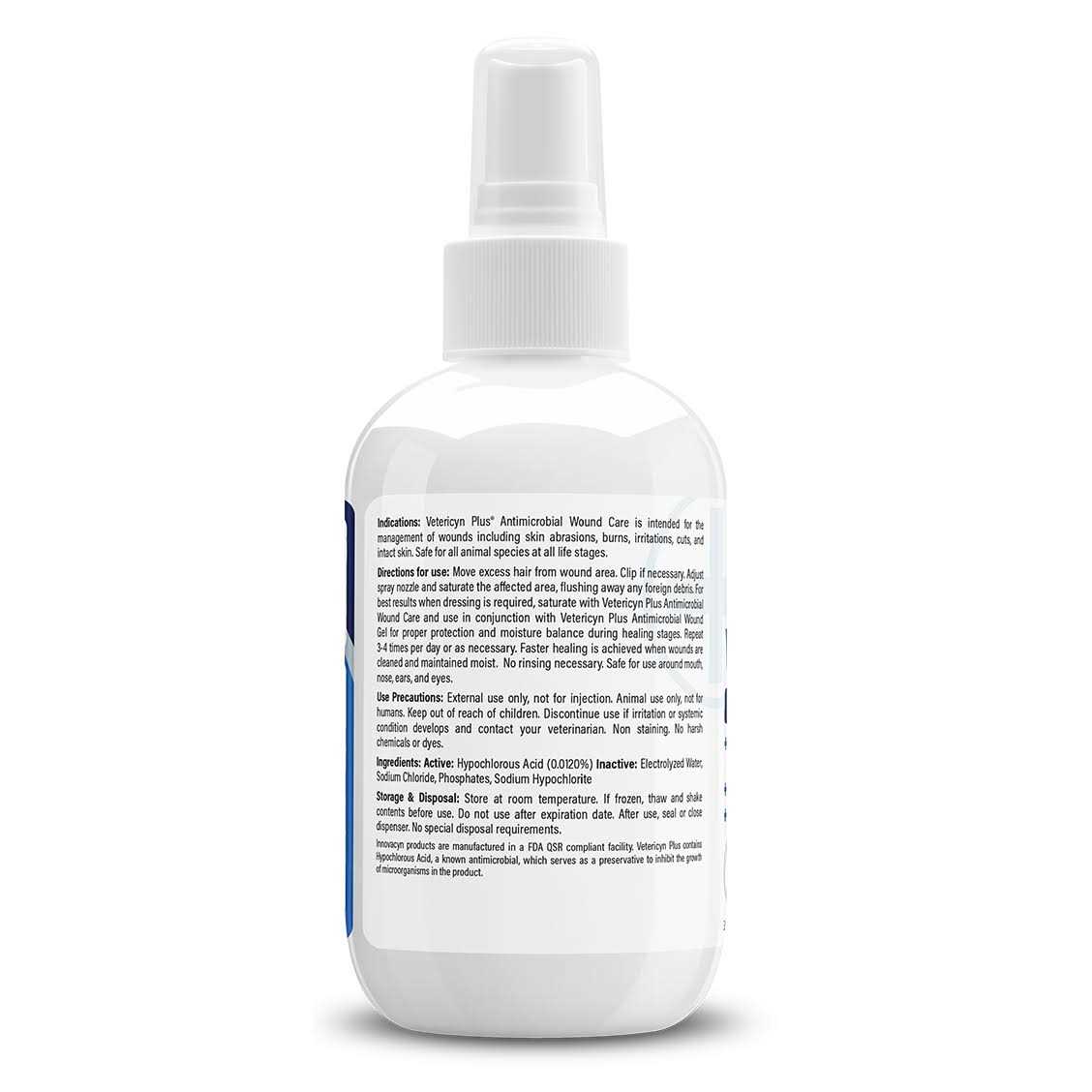 Size: 8 OZ for dogs, horses, livestock and pets treats and prevents rashes, ringworm, post-surgical sites, umbilical post, burns, eye and ear irriations, scratches, skin irritations, dryland distemper and strangles. May also be used to clean tack, wraps, saddle cinches and other equipment to prevent spread of disease and bacteria.One step wound care! Vetericyn works naturally with the animals immune system to fight infection and speed healing time. Broad-spectrum formula won’t harm healthy tissue. Helps increase blood flow and wound-healing nutrients to the wound site to speed healing. Reduces swelling and itching.Ready for immediate use, no mixing or dilution required. No-rinse formula won†t leave behind any film or residue that needs to be cleaned off. Vetrycin is as safe as water and can be used around mouth, nose and eyes. 100% biodegradeable. Does not stain furniture or clothing.