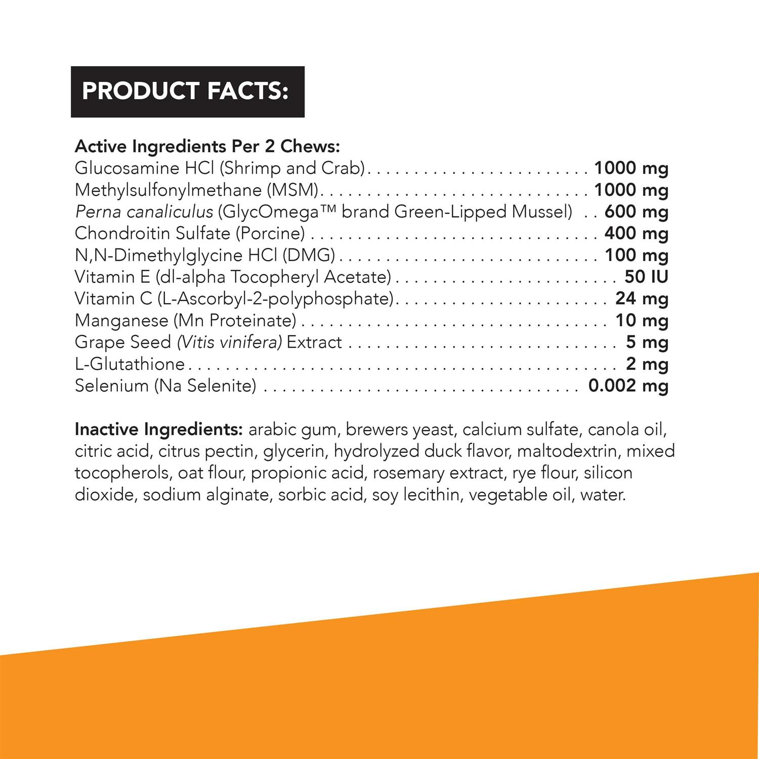 Offer your medium to larger dog delicious hip and joint support no matter how old or young she is. Specifically formulated and sized for dogs over 30 lbs, these chews are duck flavored and are recommended for dogs of all ages needing advanced joint support. Chews contain glucosamine, chondroitin, MSM, antioxidants, perna mussel, and other ingredients that help support hip and joint health. This powerful combination of ingredients helps cushion joints, promote cartilage building, and support normal mobility. For dogs of any age that weigh over 30 lbs.