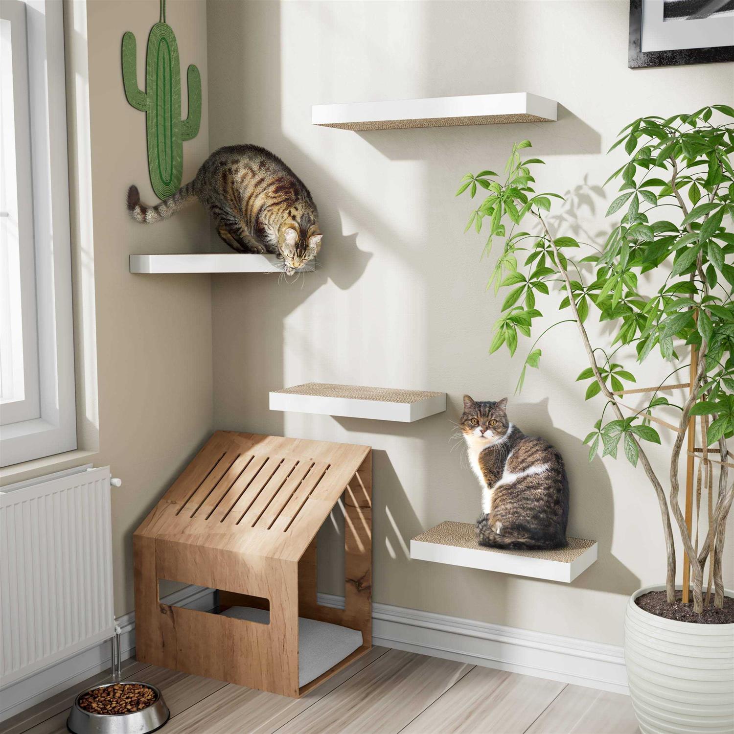 Fun meets elegance with our modern Cat Scratcher Floating Shelf Unit. Your wall will become your cat’s new favorite plaything! They can leap from shelf to shelf and maintain their claws in one go. This combo pack includes three rectangular shelves, one corner triangle shelf, and hardware.