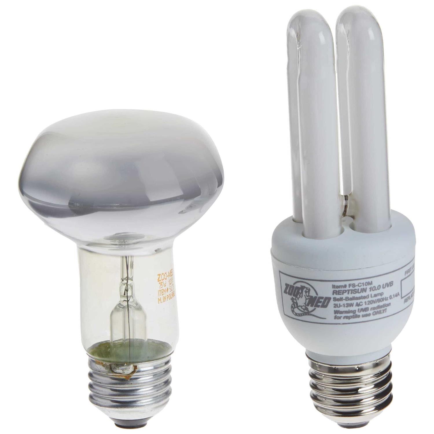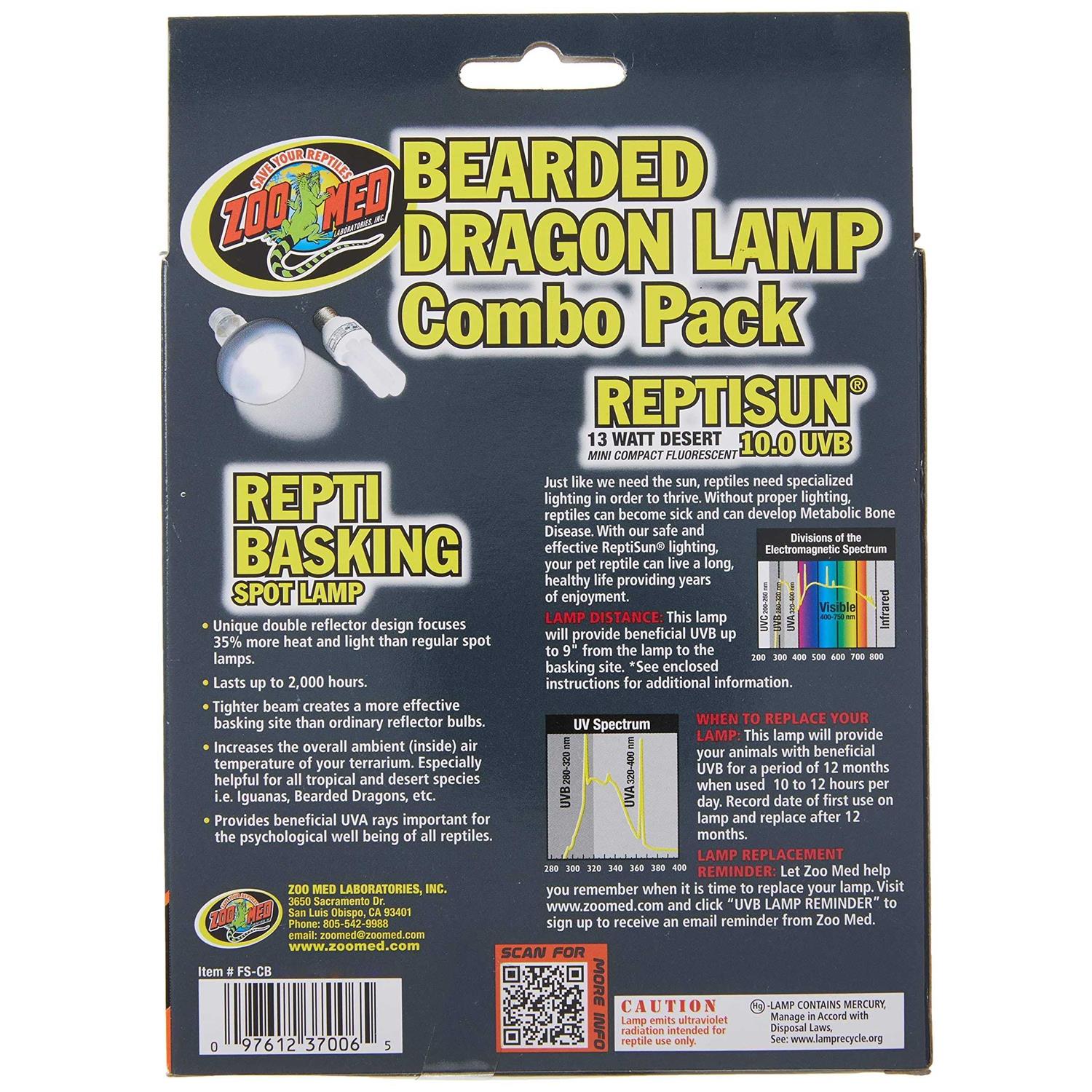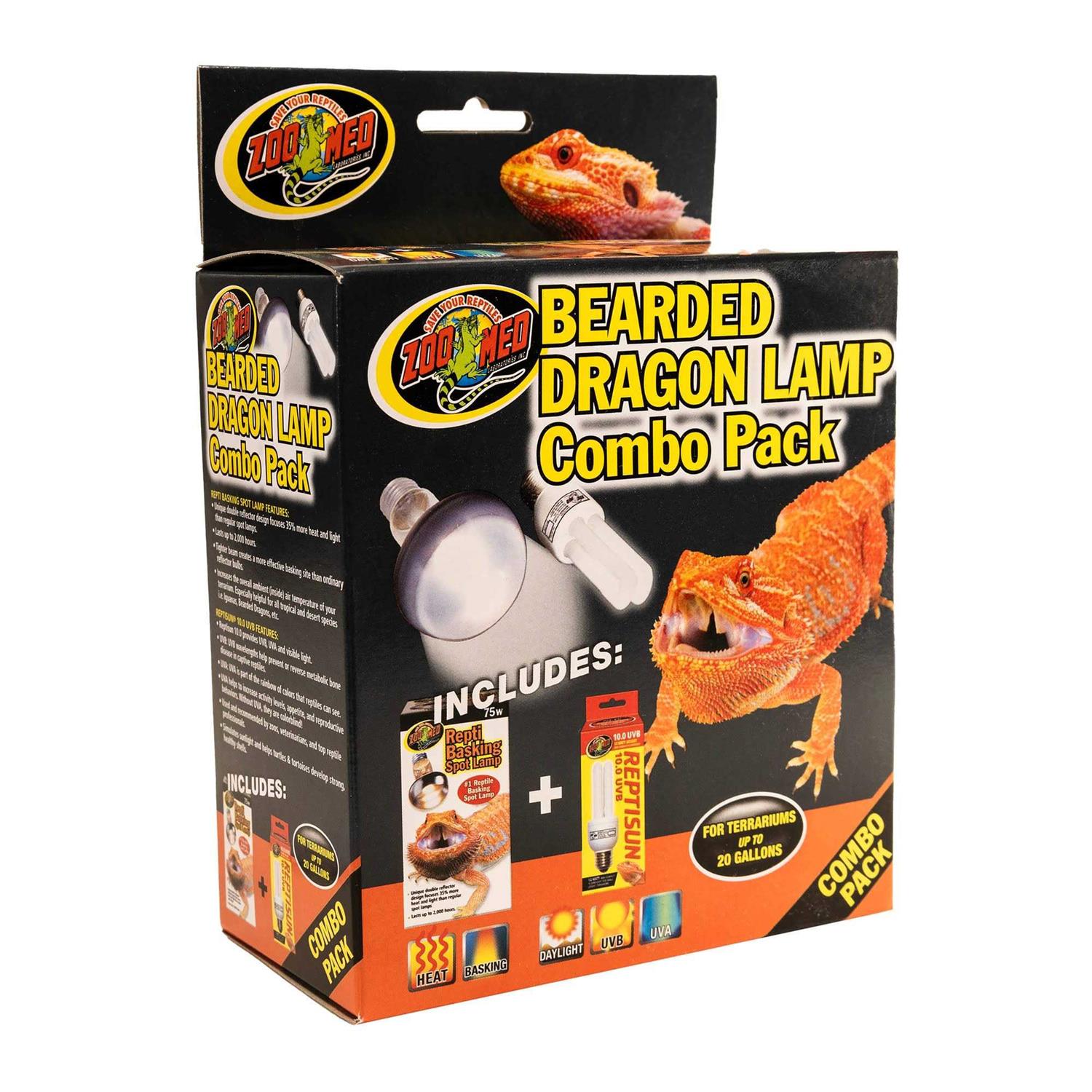 Zoo med’s bearded Dragon lamp combo pack comes with a repti basking Spot lamp 75 Watt: unique double reflector design focuses 35% more heat and uva light than regular Spot lamps and lasts up to 2, 000 hours. Reptisun 10.0 uvb Mini compact fluorescent: perfect for small terrarium desert and basking reptiles. Provides uvb, uva and visible light in a Mini compact lamp.